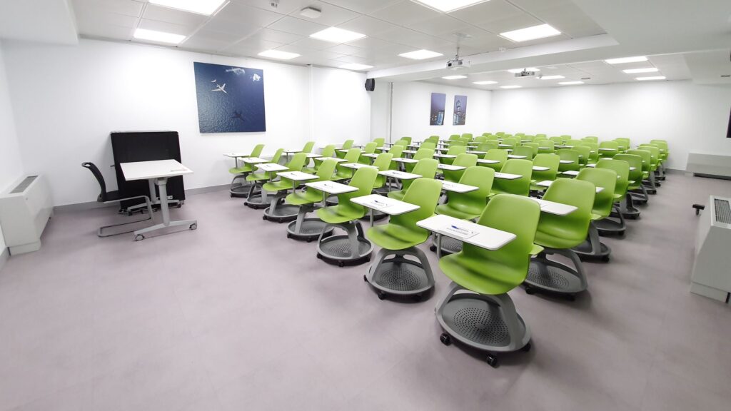 Variant of the auditorium set-up, no tables are used, but the chairs incorporate a paddle in the form of a table. Also used in trainings or courses where a laptop is not required but note-taking is.