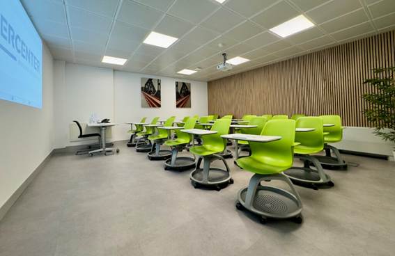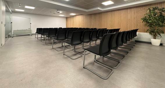 L’assemblage avec des chaises-pelletées combine l’aspect pratique de l’auditorium avec la fonctionnalité du format scolaire, offrant un équilibre entre l’attention, le confort et l’utilisation de l’espace. Grâce à l’absence de tables, la salle peut être configurée de manière flexible, en s’adaptant facilement au nombre de participants et au type d’activité.